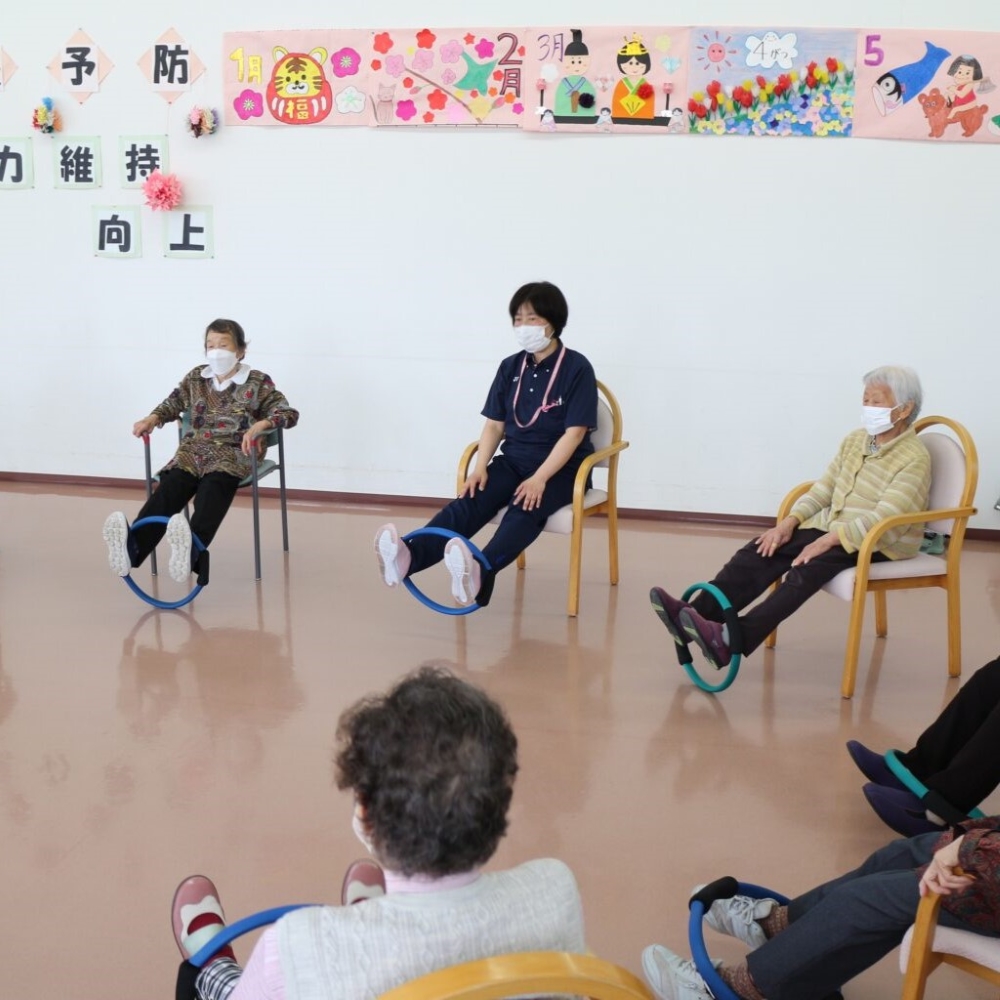 介護予防、健康維持のため、椅子に座ったままでできる軽い運動、歩行訓練のほか、トレーニングマシンを使用した運動を行います。その他にも日替わりメニューでリハビリを提供しています。
